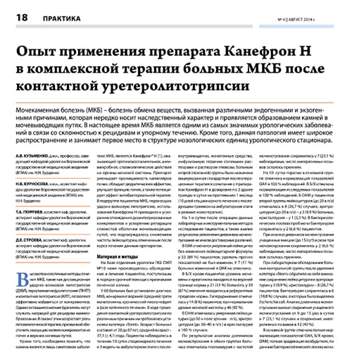Опыт применения препарата Канефрон® Н в комплексной терапии больных МКБ после контактной уретеролитотрипсии